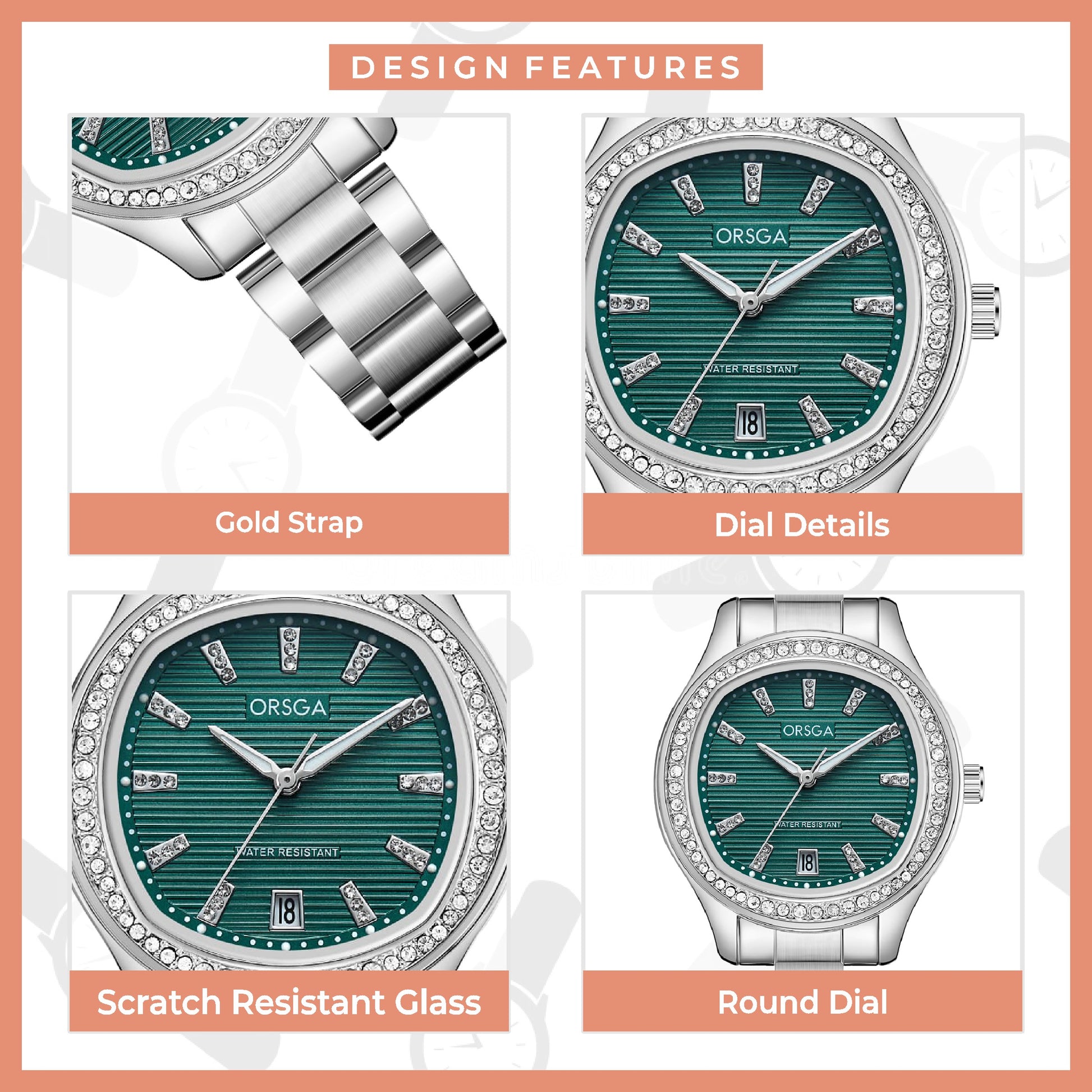 Features | Beautifully crafted green watch dial with gold watch hands |